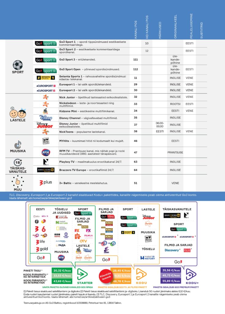 Home3 kanalite nimekiri jaanuar 2026 Kirjaveast teavitamiseks vali tekst ning vajuta CTRL+Enter Jaga Tagged: Liitumine Related Articles Teemakanalid Home3 teenusega liitumine Internet Suvekodu Seadmete kättetoimetamine ja paigaldus Home3 telepilt mitmes teleris IseteenindusMinu Home3